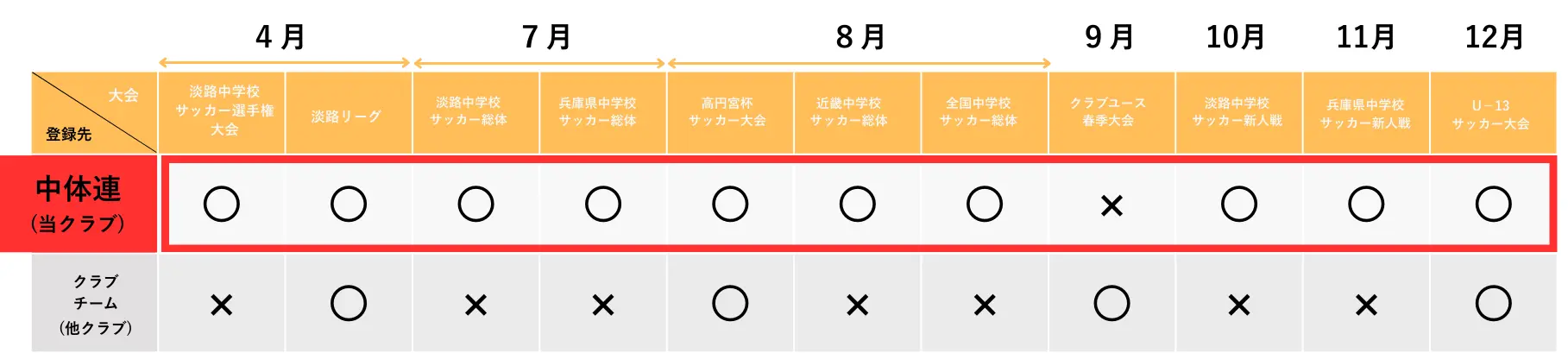 当クラブでは、以下のような公式大会に出場できます。(〇=出場可、×=出場不可)
